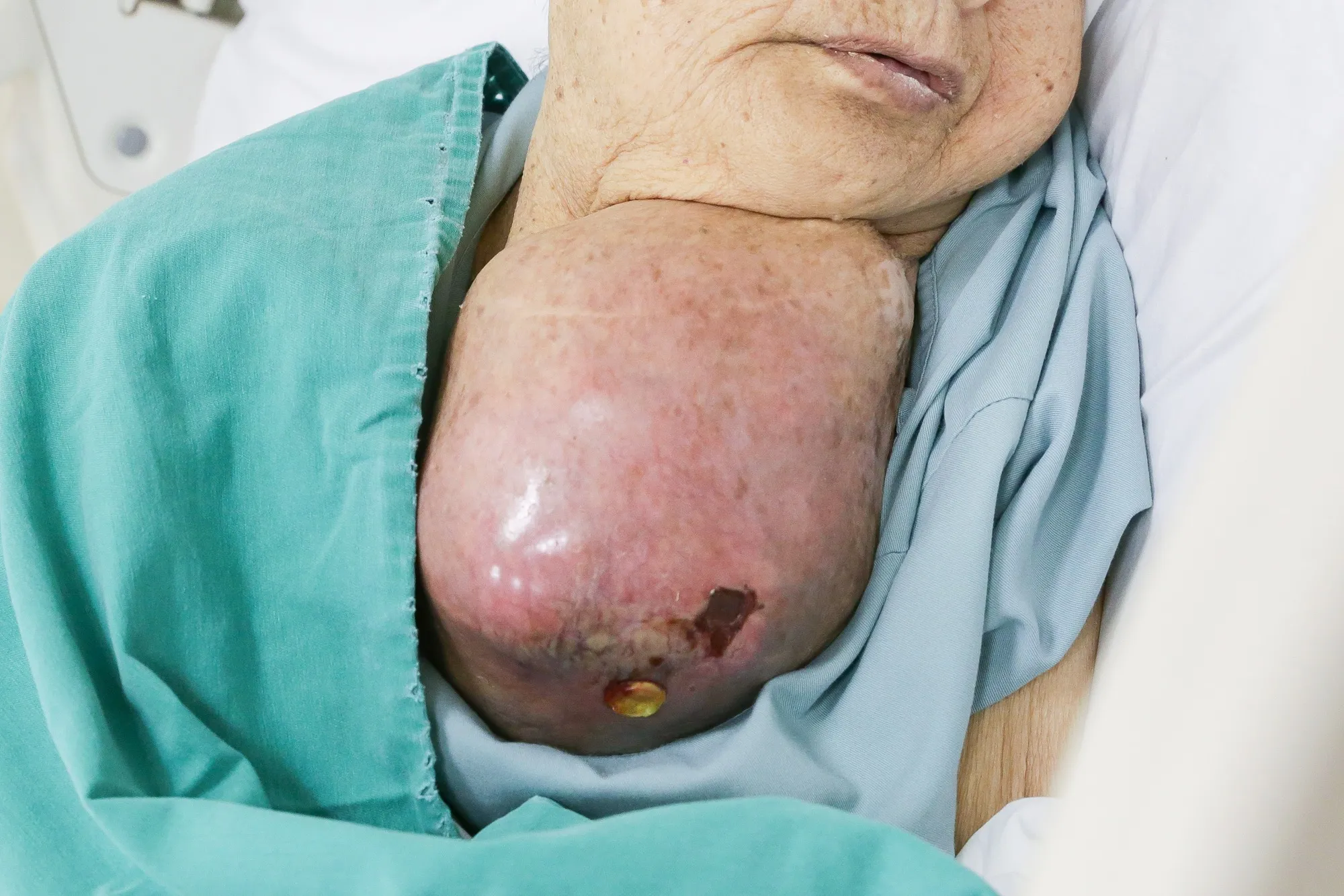 Ngày 3/11, bà được đưa đến Bệnh viện Vinmec Nha Trang trong tình trạng khối u vùng cổ - ngực khổng lồ, chèn ép khí quản và tĩnh mạch cảnh, kèm theo nhiễm trùng hoại tử rỉ mủ. Đáng lo ngại hơn, bà có nhiều bệnh lý nền nặng gồm tăng huyết áp, đái tháo đường type 2 và hẹp mạch vành.