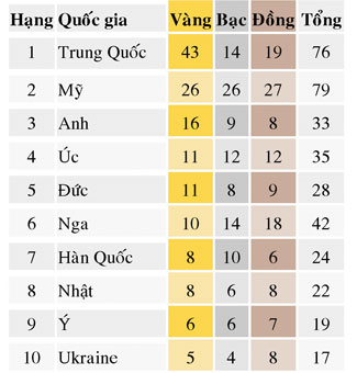 Bảng xếp hạng (tính đến 22 giờ ngày 19-8):