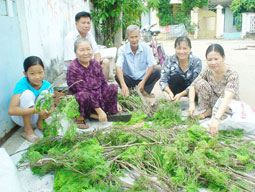 Vợ chồng bác Thoại (ngồi giữa) cùng con cháu đang chặt cây thuốc ở sân nhà. |