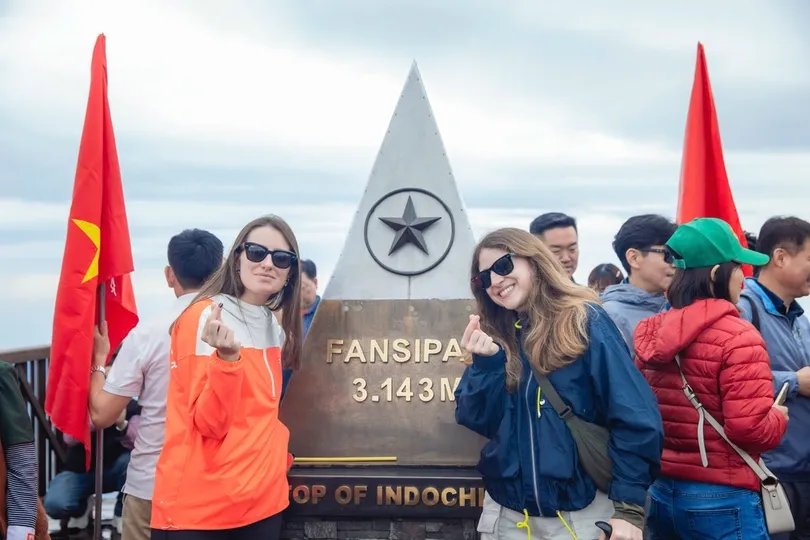 Du khách nước ngoài check-in trên đỉnh Fansipan.