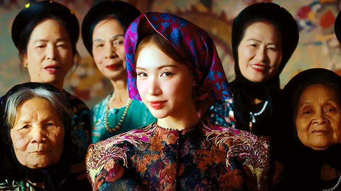 Hòa Minzy diễn xuất cùng các cụ trong làng khi đóng MV “Bắc Bling”. Ảnh chụp màn hình