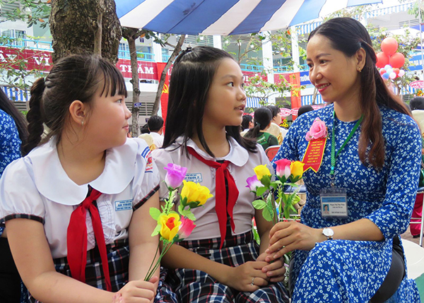 Học sinh tặng hoa cho cô giáo nhân kỷ niệm Ngày Nhà giáo Việt Nam 20-11. Ảnh: NG.NGÂN