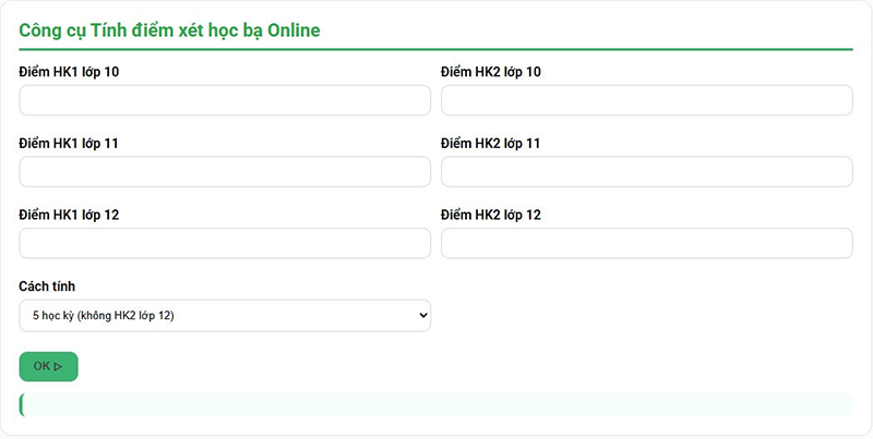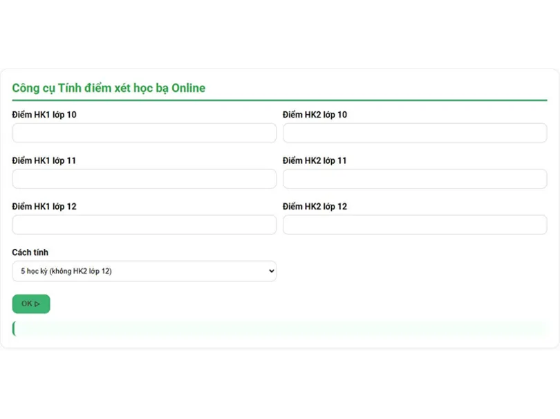 Công thức: Điểm mỗi môn = (ĐTB HK1 lớp 10 + ĐTB HK2 lớp 10 + ĐTB HK1 lớp 11 + ĐTB HK2 lớp 11 + ĐTB HK1 lớp 12) ÷ 5