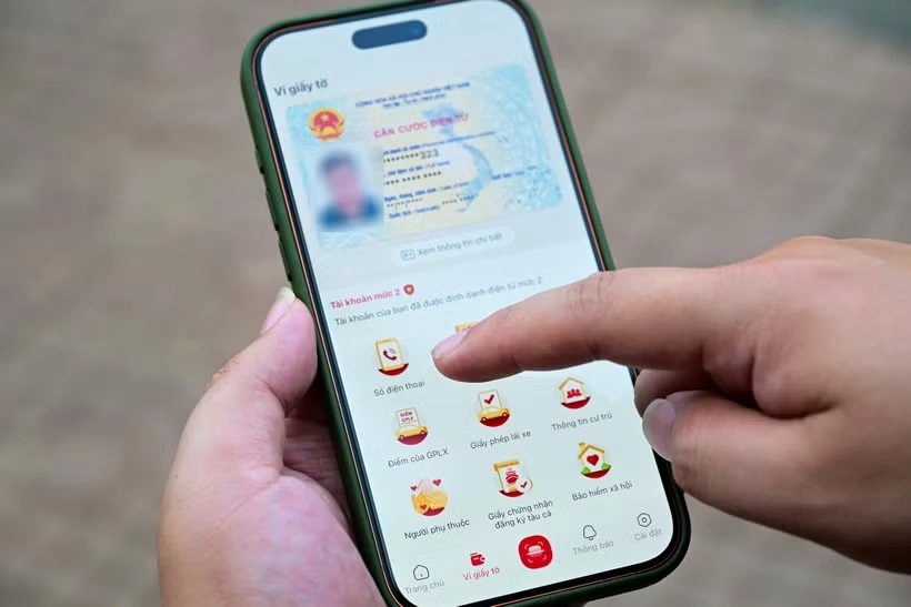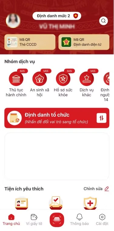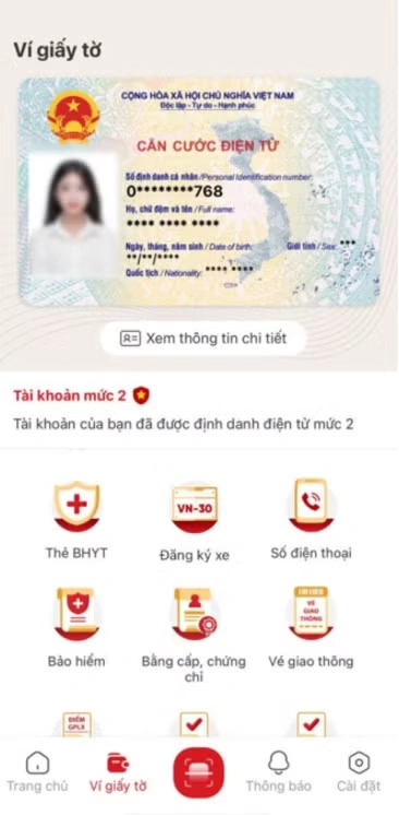 Bước 1: Đăng nhập vào ứng dụng VNeID, tại màn hình Trang chủ tài khoản định danh điện tử mức 2 nhấn Ví giấy tờ