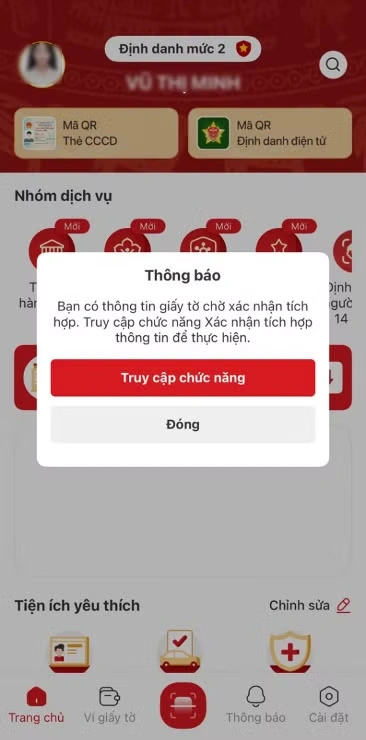 Bước 1: Đăng nhập vào ứng dụng VNeID, tại màn hình Trang chủ hiển thị thông báo, công dân nhấn Truy cập chức năng.
