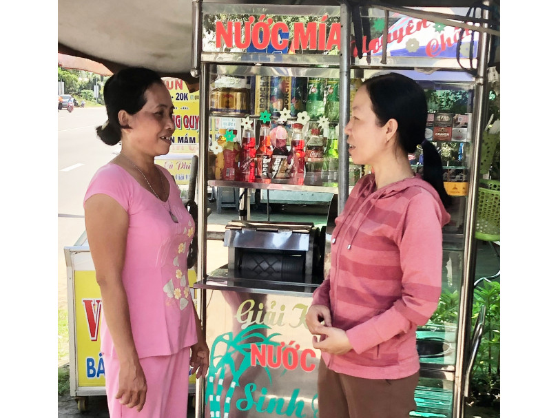 Chị Lê Diễm Thúy (bên phải) thăm hỏi, tìm hiểu đời sống, việc mua bán của chị Lý Thị Kim Phượng, hội viên phụ nữ dân tộc, có hoàn cảnh khó khăn.