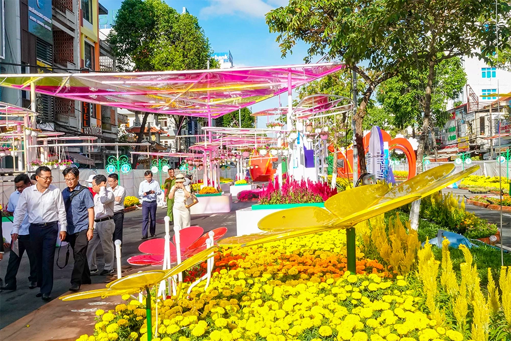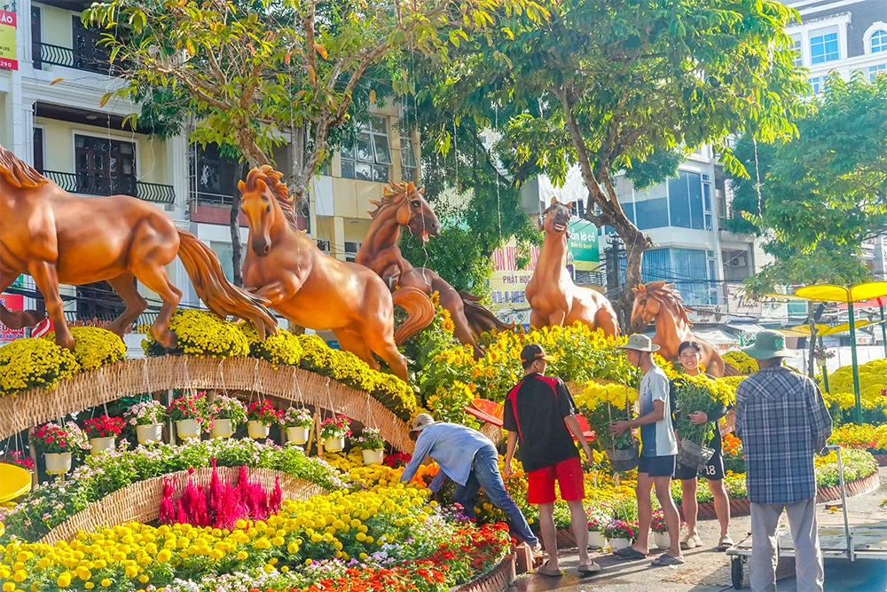 Đoạn 1 gồm các mô hình: Vuờn mai quê hương; Mừng Đảng quang vinh - Mừng xuân Bính Ngọ 2026; bánh trái truyền thống; Phước - Lộc - Thọ; mã đáo thành công cưỡi trên sóng hoa; giỏ trái cây đặc sản của thành phố…