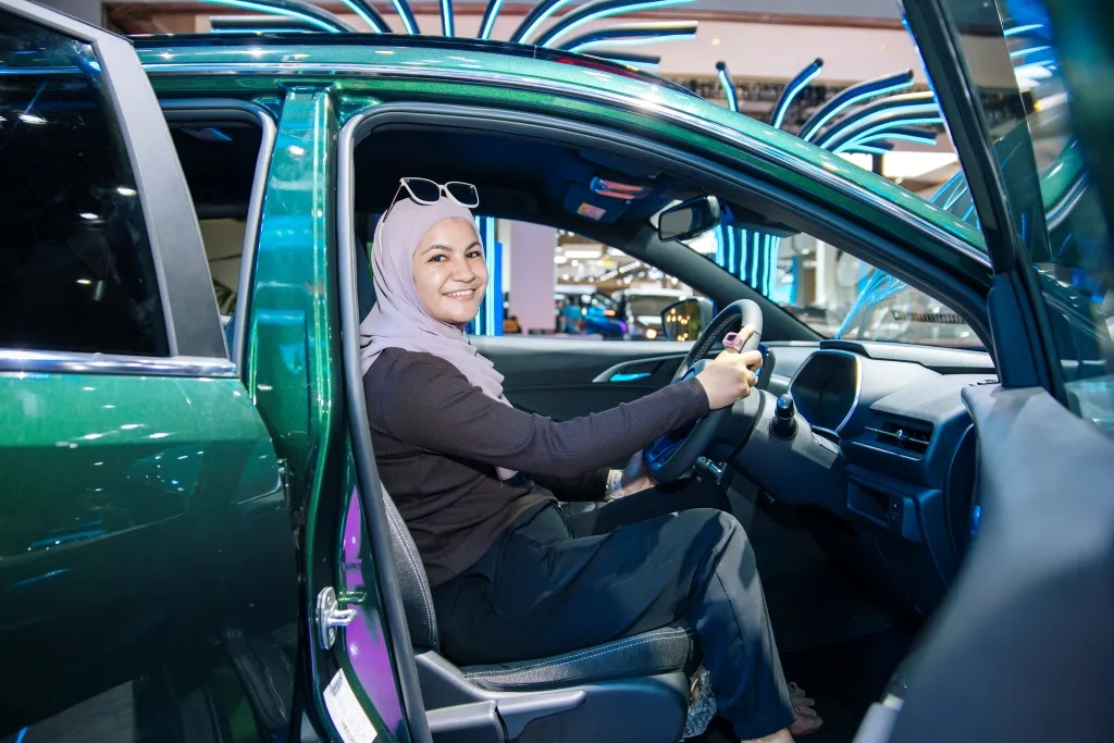 Khách hàng nữ thích thú trải nghiệm VF e34 phiên bản tay lái nghịch của VinFast.