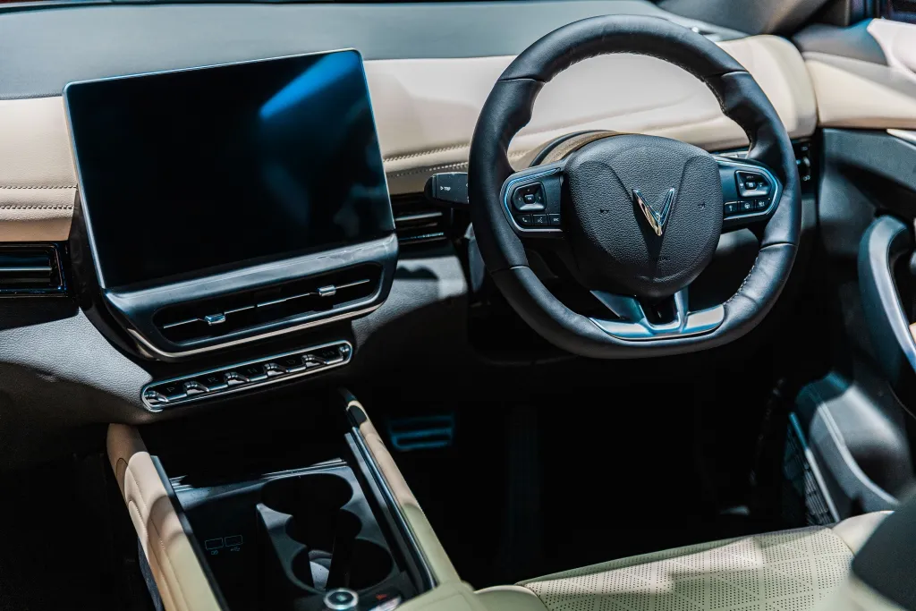 Trong khoang nội thất của VF e34, các chi tiết như cần số, nút điều khiển, vô lăng, màn hình đã được điều chỉnh vị trí phù hợp với nhu cầu thị trường nhưng vẫn đảm bảo thiết kế tối giản, hiện đại đặc trưng của xe VinFast.