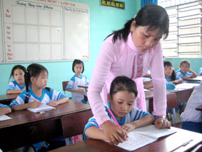 Cô Nguyễn Thị Mộng Tuyền, giáo viên Trường Tiểu học thị trấn Thới Lai 1, huyện Thới Lai đang giúp học sinh lớp 1 viết đúng quy cách. |
