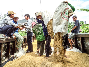 Nhân viên Công ty cổ phần Bảo vệ thực vật An Giang (Tập đoàn Lộc Trời) thu mua lúa cho nông dân trong “Cánh đồng lớn” ở huyện Châu Thành, tỉnh An Giang. Ảnh: M.T |