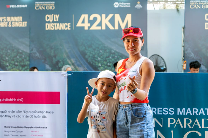 Chị Nguyễn Thị Trâm cùng con trai check-in tại VnExpress Marathon Green Paradise