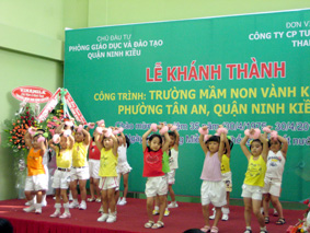 Trẻ được chăm lo tốt sẽ phát triển vững chắc trong tương lai. Trong ảnh: Các cháu Trường Mầm non Vành Khuyên, quận Ninh Kiều, TP Cần Thơ biểu diễn văn nghệ mừng khánh thành trường mới. |