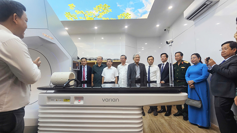 Lãnh đạo TP Cần Thơ, Quân Khu 9... tham quan hệ thống xạ trị gia tốc ở cơ sở 1. Ảnh: H.HOA