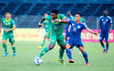 Tiền đạo Oseni (trái) bất lực trước sự đeo bám của hậu vệ Quảng Nam |