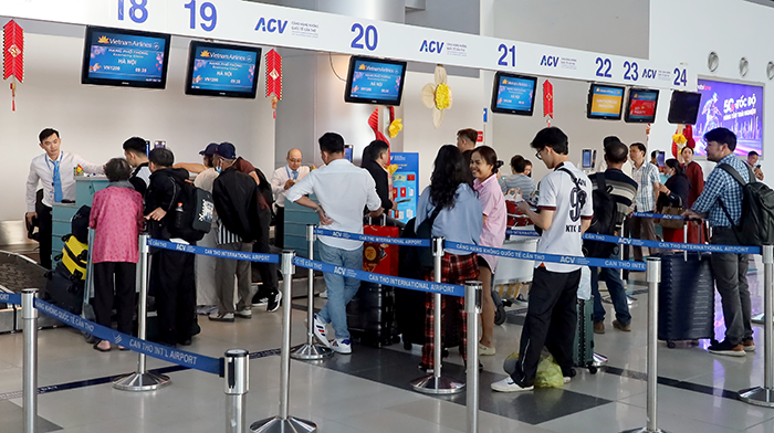 Những hành khách đầu tiên của Xuân Bính Ngọ 2026 làm thủ tục hàng không tại Cảng Hàng không quốc tế Cần Thơ.