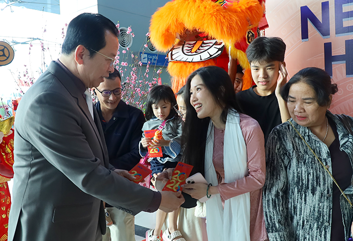 Ông Vương Quốc Nam, Phó Chủ tịch UBND TP Cần Thơ, lì xì những hành khách "xông đất" Cảng Hàng không quốc tế Cần Thơ ngày đầu năm Bính Ngọ.