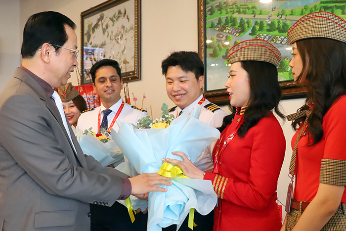 Ông Vương Quốc Nam, Phó Chủ tịch UBND TP Cần Thơ, tặng hoa tổ bay phục vụ chuyến bay đầu tiên Xuân Bính Ngọ 2026 của Hãng Vietjet đến TP Cần Thơ