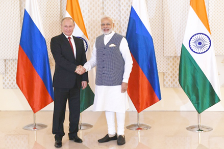Thủ tướng Ấn Độ Modi (phải) đón tiếp Tổng thống Nga Putin ngày 15-10. Ảnh: AFP |