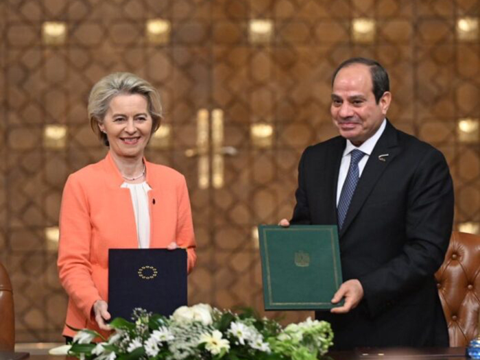 Tổng thống Ai Cập Abdel-Fattah El-Sisi (phải) và Chủ tịch Ủy ban châu Âu Ursula von der Leyen ký thỏa thuận hỗ trợ tài chính ngày 17-3 tại Cairo. Ảnh: Nova News