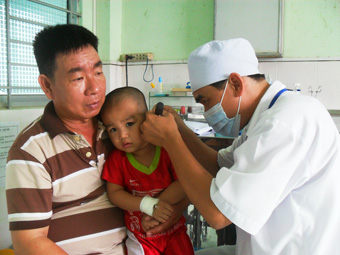 Bác sĩ CKII Hồ Lê Hoài Nhân kiểm tra tai cho bệnh nhi. |