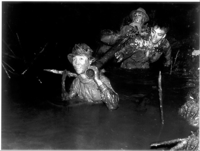 Quân Giải phóng khiêng súng cối qua đầm lầy để tấn công đồn Cái Keo, Cà Mau, năm 1963 Ảnh: Trần Bỉnh Khuôl
