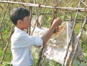 Nguyễn Thanh Tòng đang mót đậu trên rẫy. |