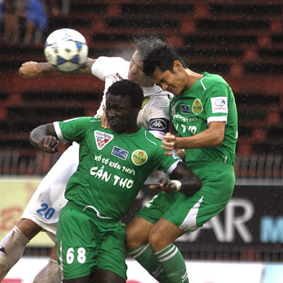 Trung vệ Văn Quân (bìa, phải) cản phá dũng mãnh cú đánh đầu của tiền đạo Gonzalo (Hà Nội T&T).