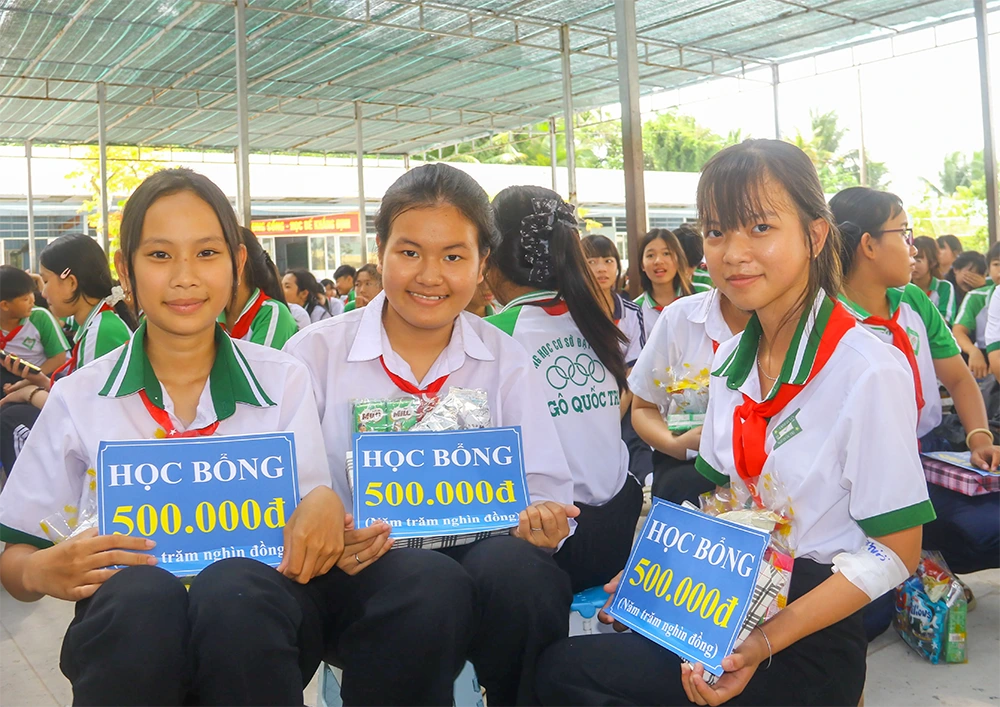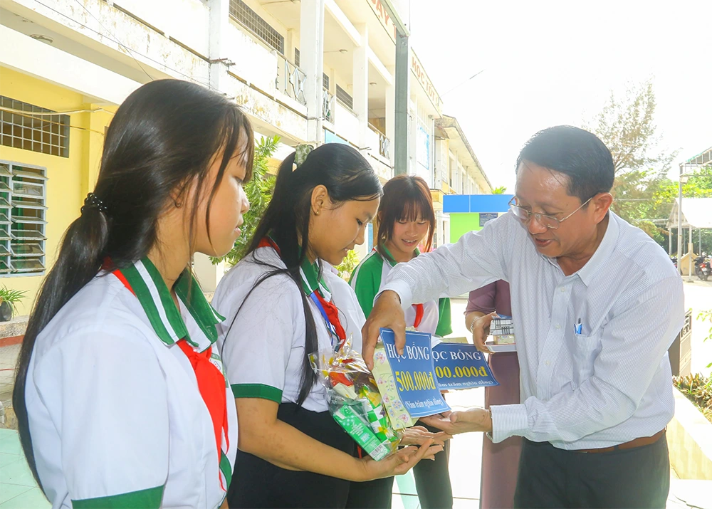 Ông Hồ Thanh Hải, Giám đốc Trung tâm Công tác xã hội TP Cần Thơ tặng quà, học bổng cho thành viên câu lạc bộ Tuổi hồng.