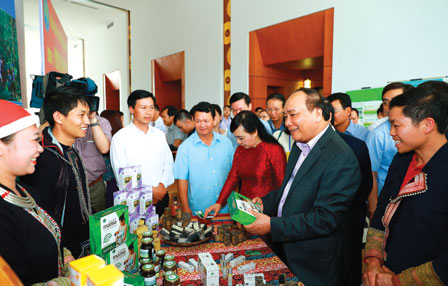 Thủ tướng Nguyễn Xuân Phúc thăm các gian hàng trưng bày sản phẩm tại hội nghị. Ảnh: THỐNG NHẤT (TTXVN) |