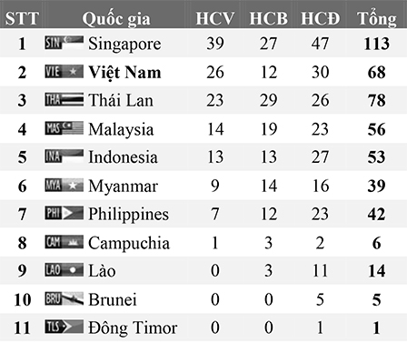 Bảng tổng sắp huy chương SEA Games 28 (tính đến 21 giờ ngày 8-6)