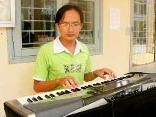 Hữu Tiến đang tập văn nghệ cho cuộc thi tiếng hát HSSV toàn thành. |
