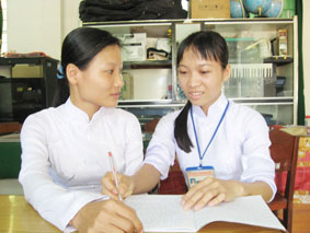 | Mai Thị Mỹ Thanh (phải), sinh viên lớp Cao đẳng Mầm non khóa 30, Trường Cao đẳng Cần Thơ đang cùng bạn ôn bài. Ảnh: B.NG |