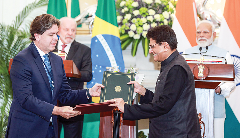 Thủ tướng Ấn Độ Modi và Tổng thống Brazil Lula da Silva chứng kiến lễ ký MoU về tăng cường hợp tác trong lĩnh vực khai thác khoáng sản quan trọng hôm 21-2. Ảnh: ANI
