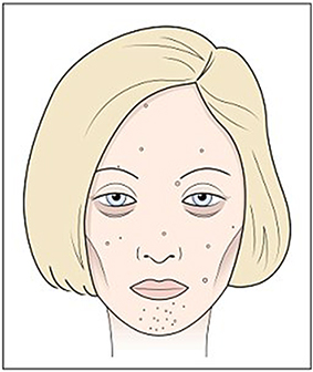 Đặc điểm nhận diện là gương mặt hốc hác và tái nhợt, có nhiều nếp nhăn trên trán, vùng da dưới mắt chảy xệ, nổi mụn khắp mặt và lông mày thưa thớt.