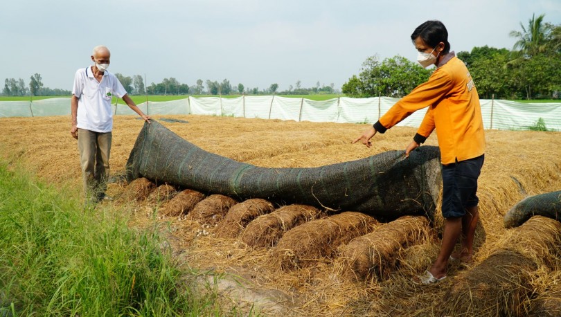 Anh Lương Văn Hào, người dân trong ấp (bên phải) trồng nấm rơm, có thu nhập cao.