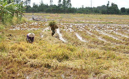 Cách nay 2 tuần, giá thuê máy gặt đập liên hợp (GĐLH) để thu hoạch lúa tại nhiều nơi chỉ ở mức 250.000-260.000 đồng/công (lúa không đổ ngã) thì nay tăng lên mức 280.000-300.000 đồng/công; còn đối với các diện tích lúa bị đổ ngã từ 30-70% muốn thuê máy GĐLH thu hoạch, nông dân phải chịu giá từ 350.000-400.000 đồng/công, thậm chí 500.000 đồng/công đối lúa bị đổ ngã hoàn toàn. Đối với diện tích lúa bị đổ ngã nhiều và có nền đất yếu hoặc do có diện tích nhỏ mà máy GĐLH không thể vào ruộng để thu hoạch lúa, nhà nông còn phải tốn nhiều chi phí hơn trong việc thu hoạch lúa. Nguyên nhân do hiện giá thuê mướn nhân công cắt lúa bằng tay đã ở mức 350.00-400.000 đồng/công lúa, thuê công vạn ở mức: 150.000-200.000 đồng/công lúa và suốt lúa 150.000 đồng/công, tính ra chi phí thu hoạch một công lúa ở mức 650.000-750.000 đồng.
