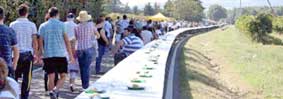Đó là chiếc bàn có chiều dài 1.760m (ảnh), đặt tại vùng ngoại ô Bosco kéo dài đến Borzano, gần thành phố Parma (Ý). Nó đủ chỗ cho 2.700 người dùng bữa và cần một chiếc khăn trải bàn dài đến 1.800 m. Ấn tượng hơn hết là tất cả công tác chuẩn bị từ thiết kế chiếc bàn đến mời gọi mọi người khắp nơi tụ hội về để thưởng thức bữa trưa trên chiếc bàn dài này chỉ diễn ra trong 20 ngày. “Chúng tôi muốn tổ chức một bữa trưa thực sự đặc biệt và chúng tôi sẽ dành tặng tất cả tiền thu được cho bệnh viện Madonna dellUliveto của địa phương” - nhà tổ chức cho biết. Và theo đánh giá của một khách mời khó tính thì đây thực sự là một bữa tiệc “hoành tráng”, dù bồi bàn phục vụ hơi chậm.