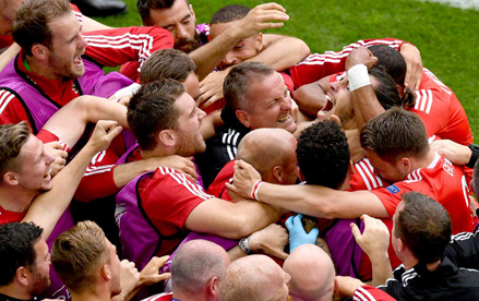 Tập thể đội bóng xứ Wales ăn mừng bàn thắng đầu tiên tại Euro. Ảnh: Uefa |