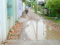 Hẻm 232 đường 30-4, phường Hưng Lợi thường xuyên bị ngập nước, người dân đổ xà bần để thuận tiện đi lại. Ảnh chụp lúc 9 giờ ngày 8-8-2008. |