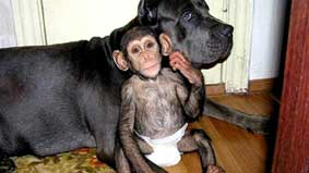 Một con tinh tinh ở Nga vừa được chó nhận nuôi sau khi bị mẹ nó bỏ rơi. Một nhân viên sở thú đã đem con tinh tinh tội nghiệp về nhà để nuôi sau khi chứng kiến cảnh mẹ nó không chịu chăm sóc con. May mắn là chỉ vài giờ sau, tinh tinh được con chó vừa mới sinh con trong nhà chấp nhận nó như một “cún con”.