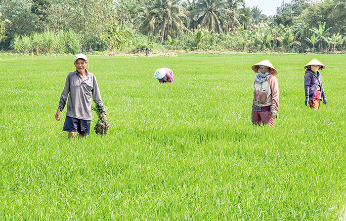 Nông dân ở xã Thới Lai chăm sóc lúa đông xuân.