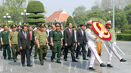 Chủ tịch nước Trần Đại Quang tới đặt vòng hoa, dâng hương tưởng niệm các Anh hùng, liệt sĩ tại Nghĩa trang Liệt sĩ A1. Ảnh: NHAN SÁNG (TTXVN)