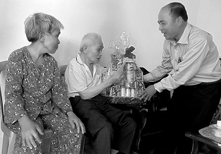 Đồng chí Lê Hoàng Nam, Bí thư Quận ủy Bình Thủy (TP Cần Thơ) tặng quà cho ông Hoàng Minh Trác ngụ phường Trà Nóc. Ảnh: KIỀU NƯƠNG