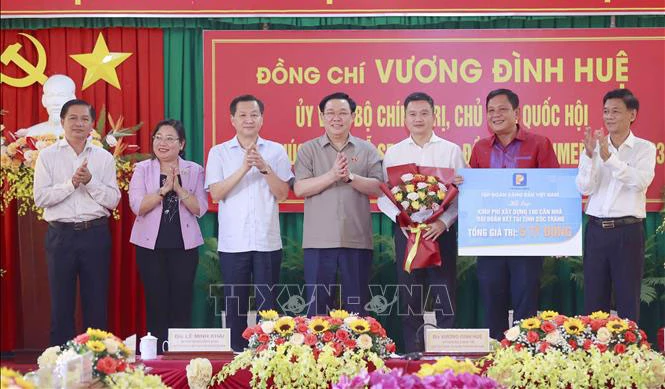 Chủ tịch Quốc hội Vương Đình Huệ chứng kiến Tập đoàn Xăng dầu Việt Nam trao 5 tỷ đồng hỗ trợ kinh phí xây 100 căn nhà đại đoàn kết tại tỉnh Sóc Trăng. Ảnh: Doãn Tấn - TTXVN