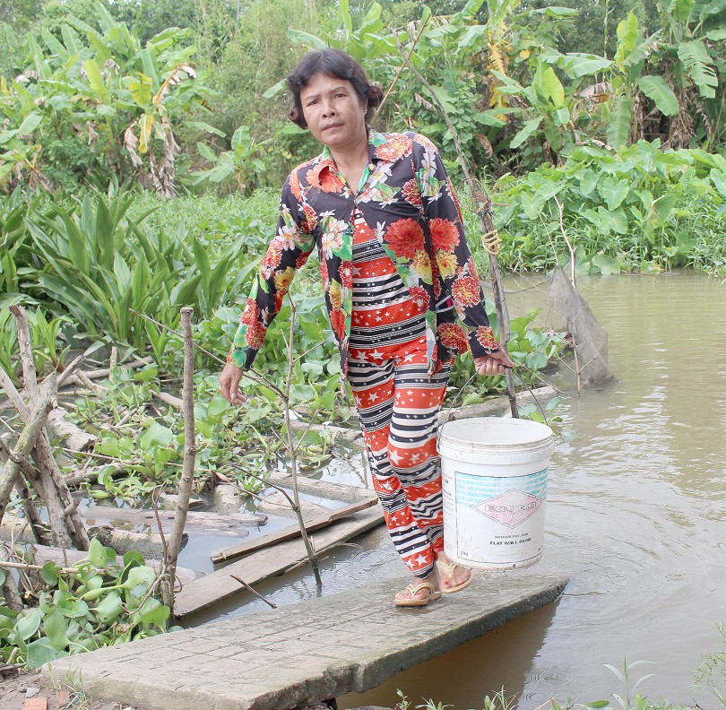 Hằng ngày, bà Trần Thị Minh phải canh nước lớn để xách nước dưới rạch Ngọn Khoán Châu lóng phèn sử dụng.