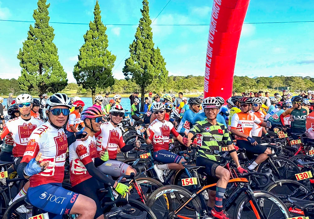 VĐV Lê Văn Động (thứ 4 từ trái qua) cùng đồng đội tham dự một giải đua xe đạp phong trào ở Lâm Đồng, trong quá trình chuẩn bị cho giải tại Cần Thơ. Ảnh: CTV