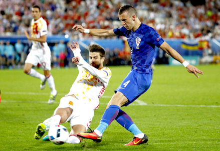 Pha tranh truy cản bóng của các cầu thủ Tây Ban Nha trong trận gặp Croatia. |
