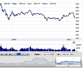 VN-Index đi xuống từ mốc 625 điểm thiết lập ngày 22-10-2009 đến nay.
