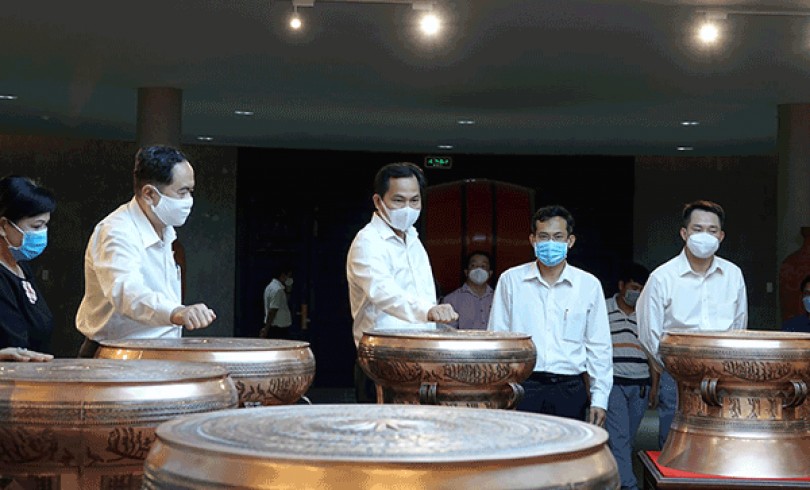 Ðồng chí Trần Thanh Mẫn, Ủy viên Bộ Chính trị, Phó Chủ tịch Thường trực Quốc hội và đồng chí Lê Quang Mạnh, Ủy viên Ban Chấp hành Trung ương Ðảng, Bí thư Thành ủy Cần Thơ, tham quan không gian trưng bày tại Ðền thờ Vua Hùng tại TP Cần Thơ. Trong ảnh: Các đại biểu tham quan “Bộ trống Cửu Long”.